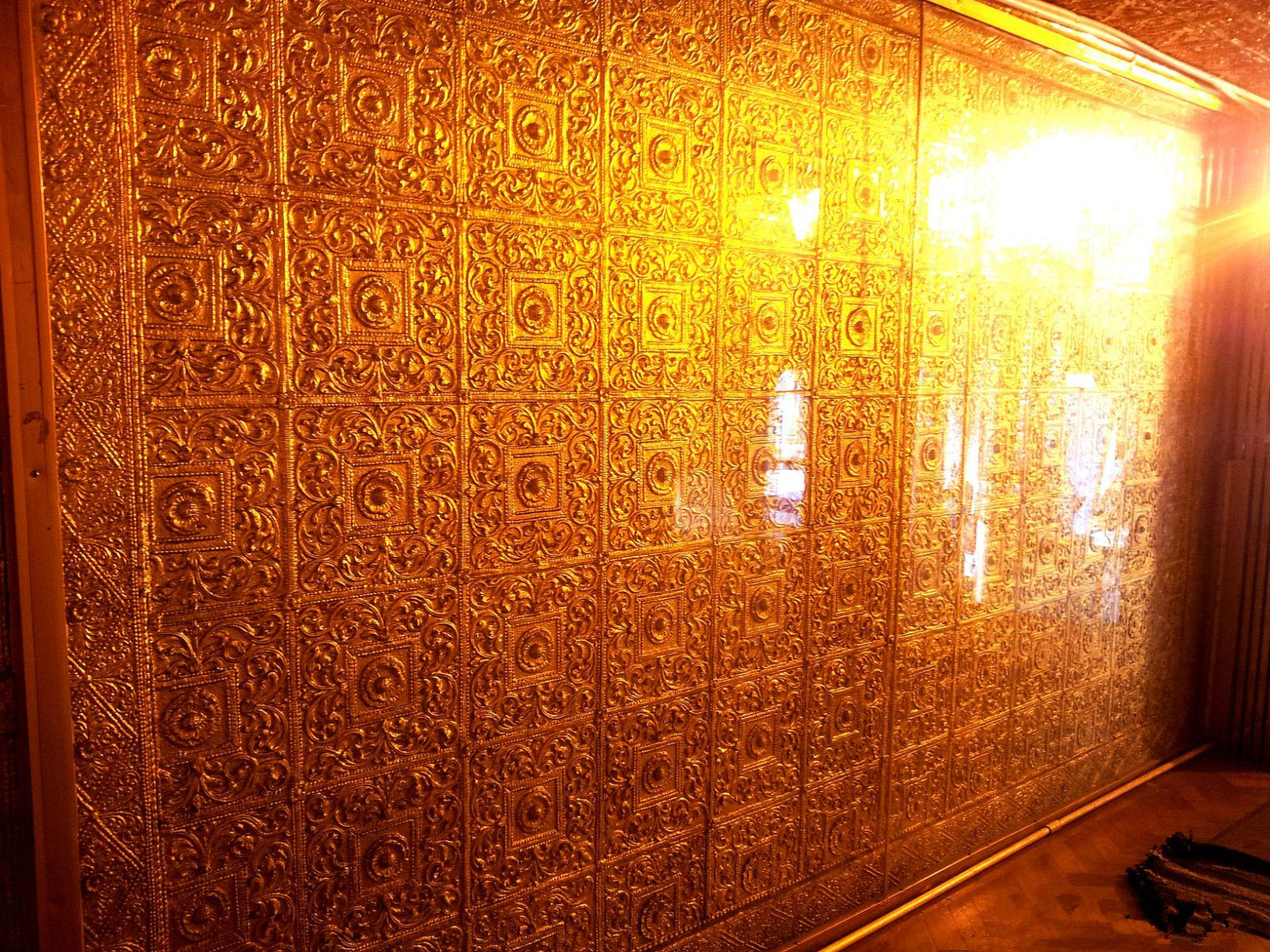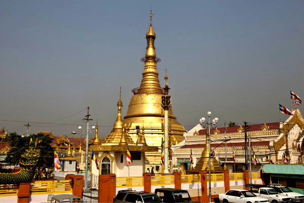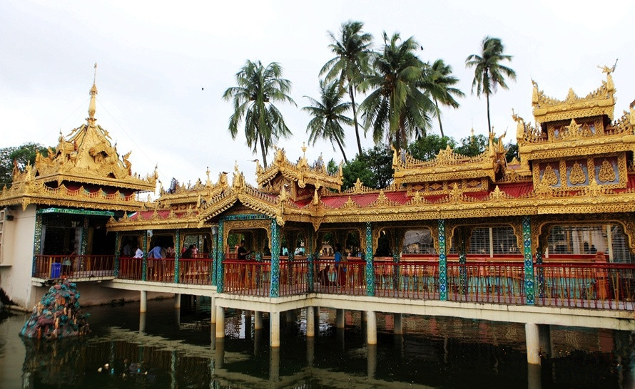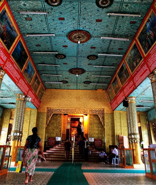波特涛塔(Botataung Pagoda),又名“千佛塔”,位于仰光河北岸的老城区旁。佛塔修建于2000多年前,据传,当年从印度护送圣物到此的千佛也陪葬在这,故起名“千佛塔”。这座塔是中空塔,内部建有黄金屋密室。密室内,所有的墙壁和天花板上都贴满了金箔,置身其间,环顾四周,满眼金色,富丽堂皇。密室内的最核心处藏有佛主的头发,但不轻易示众,信徒们只能隔着铁栅栏和玻璃窗顶礼膜拜。
