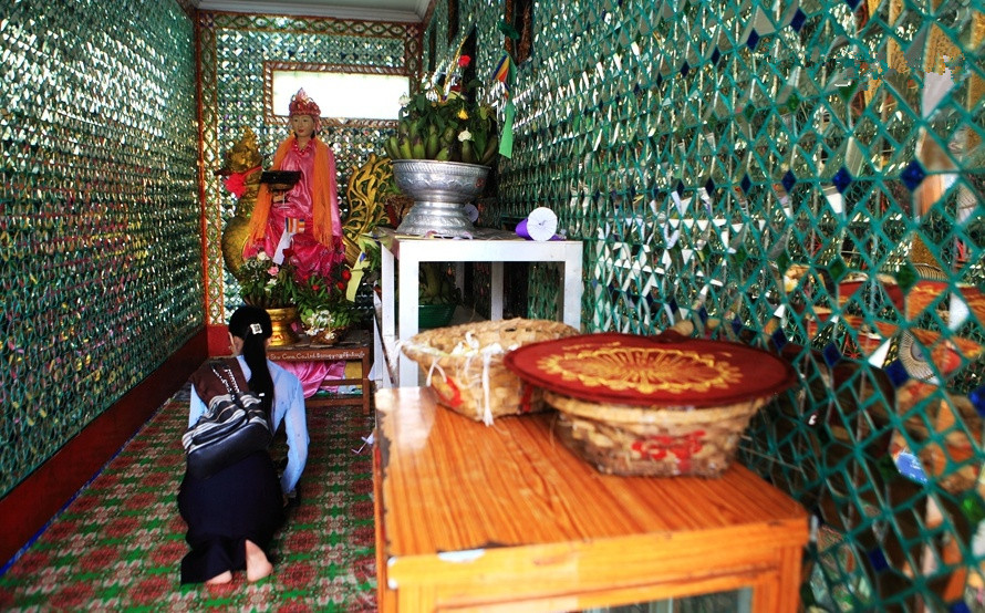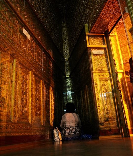 东南亚人爱用艳色,缅甸似乎又更胜一筹 他们喜欢用一切金光闪闪的材料来装点佛寺 他们会在最庄严重要的建筑上贴上金箔与宝石 另一些则镶嵌满了能折射光线的菱形彩色玻璃,十分璀璨耀眼。