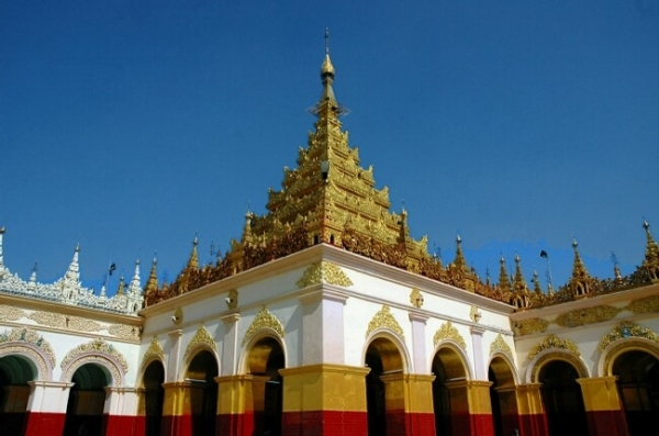 这里是曼德勒最出名的寺庙,是为了安置著名的摩诃牟尼佛像而建的。佛像为金属质地,端坐,高约3.7米。塔内墙上挂着许多长发,据说都是佛徒们许愿奉献的。