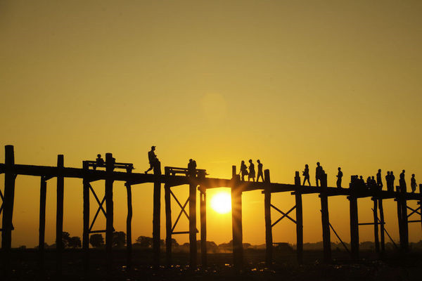 离曼德勒四十分钟外的乌本桥,是一座纯柚木的桥。柚木具有很好的抗腐的作用,造型单一却长得可歌可泣,一公里的桥上来来往往的全是游客,渔民,当地居民。能看到一场没有云打扰的纯粹的日落。