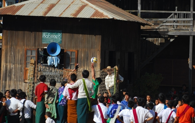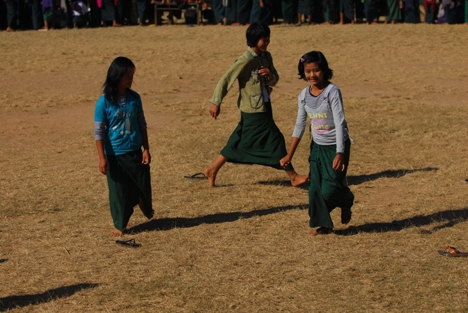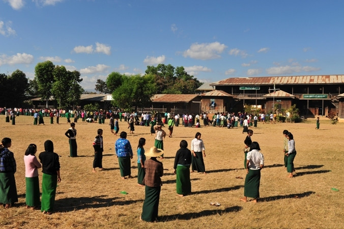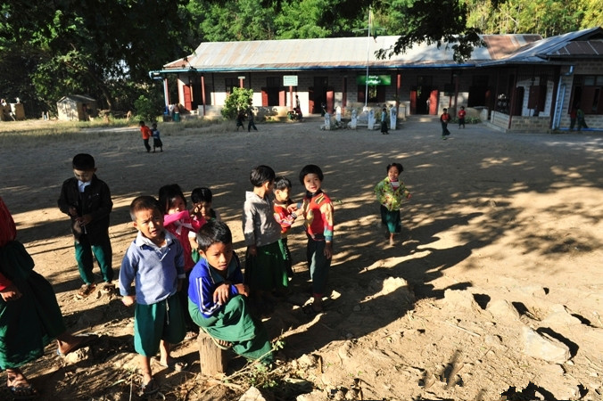 朝周围看去,不远处就是一座小学,校舍相当简陋,但有个简易的泥地操场,应该还没到上课时间,一群孩子在操场上玩耍,很多娃娃脸上涂着缅甸特有的护肤品“特纳卡”。