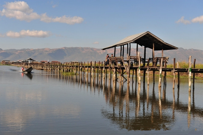 从学校边的土路转西,不到一公里就是湖边,有一座相当古朴的长木桥,但并不能通往对岸。与船家讨价还价,几个美金把两个人和两部自行车弄上小船,突突地往西边驶去。