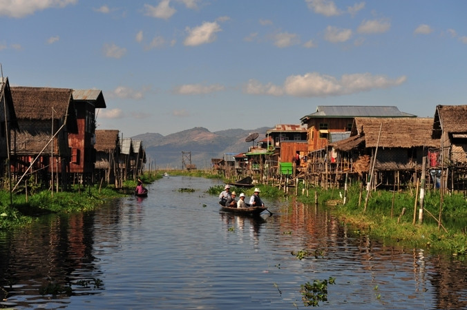 这是相对狭窄的一段湖面,两边是水上村落和浮岛种植区,中间的水域里又看到茵莱湖独有的单脚划桨,还惊起了大群水鸭。西边最醒目的是水边和半山的几座小寺庙,水边有条浮岛间的狭长水道,总体不到半小时就乘船从湖东侧到了西岸。