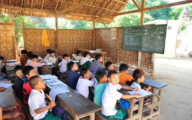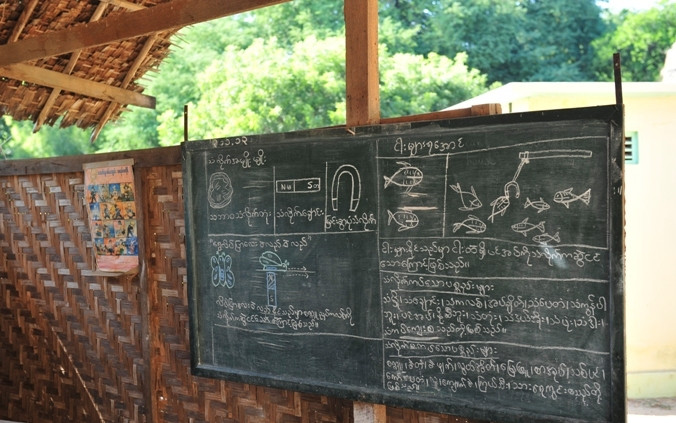 后又在曼德勒郊外偶遇一所小学,教室是一座简易的棚子,三十多个小学生坐在与椅子一体的长排课桌前,黑板上的内容一边与磁铁的理论有关,另一边是算数的应用题。旁边的房子里是更小的孩子,看上去象幼儿园,一位老师正在带领小朋友做游戏。