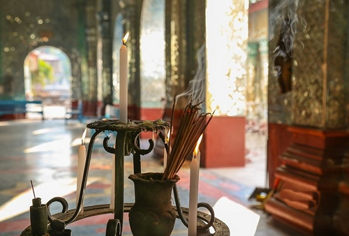 佛祖的传奇,在这里被描绘得栩栩如生;信仰的力量,在这里被展现得淋漓尽致。加乌库塔其寺院(Kyauktawgyi Paya),是曼德勒山脚下另一处不容错过的佛塔。寺庙位于曼德勒山南面入口附近,镇寺之宝是一尊由一块重达800吨的大理石雕刻而成的大佛。当年,仅仅搬运这块巨大的石头,就动用了上万工人,耗费了无数个日夜,艰辛程度难以想象。面对这尊庞大的佛像,观赏者能够深深体会其建造时的不易,从而对缅甸人虔诚的佛心感触更深。佛塔周围有佛祖众多门徒的塑像,将巍峨的大佛像衬托得更加肃穆庄严。