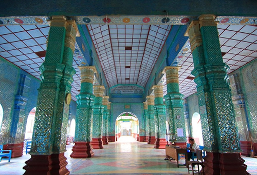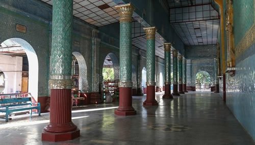 据称为了从伊洛瓦底江运这块大理石,总共花了13天的时间,动用了上万名工人。佛塔内墙和石柱全都用菱形的小块玻璃镶嵌,在阳光和灯光照耀下,金碧辉煌。