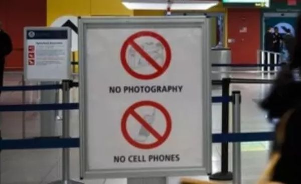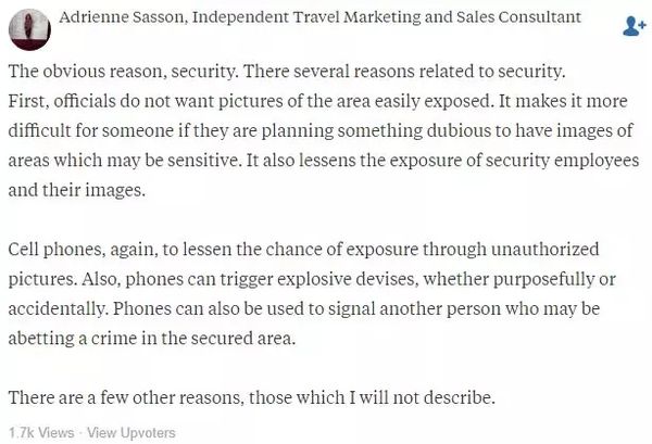 @Adrienne Sasson:最显而易见的原因就是:安保。首先,海关工作人员不想轻易让通关区域的照片曝光,不让用手机相机就能减少照片曝光的可能,也能减少安保人员照片曝光的可能性。其次,手机可以被用来引爆炸弹,也能用来向已经进入安全区域的人发送信号实施犯罪。
