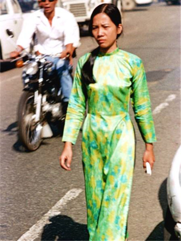 直到1975南越解放前,此时的奥黛呈现各种嬉皮、迷幻的风格,也有迷你裙化的倾向。南北统一之后,奥黛几乎消失殆尽;只允许在少数场合,例如婚礼时才能穿。【越南西贡,1972年。摄影:尼克·德沃尔夫】