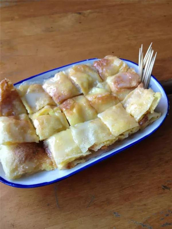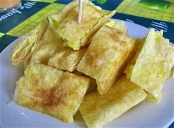 缅甸甩粑粑以鸡蛋液和成的面团,用手甩成片,包入馅料,煎制而成。色泽金黄质地松脆,味道香甜。