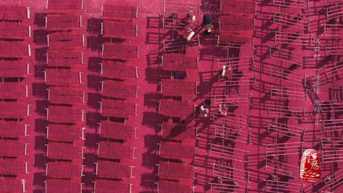 这是福建泉州汉口村晒香的场景,一叠叠篾香正被工人们铺上木架,接受阳光和风的“洗礼”。