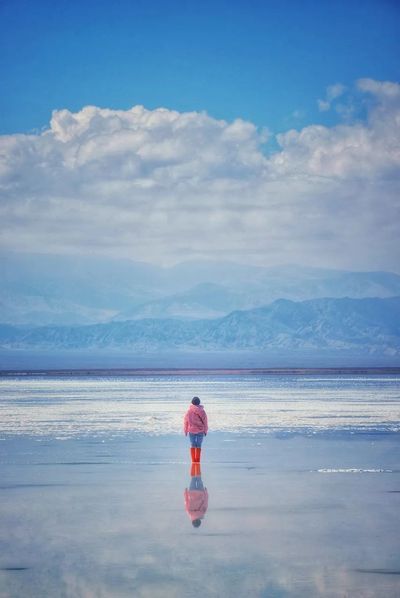 纯纯的白、清晰的倒影、远处的雪山,蔚蓝的天,晶莹的盐湖,蓝白交织,如同在梦境一般。