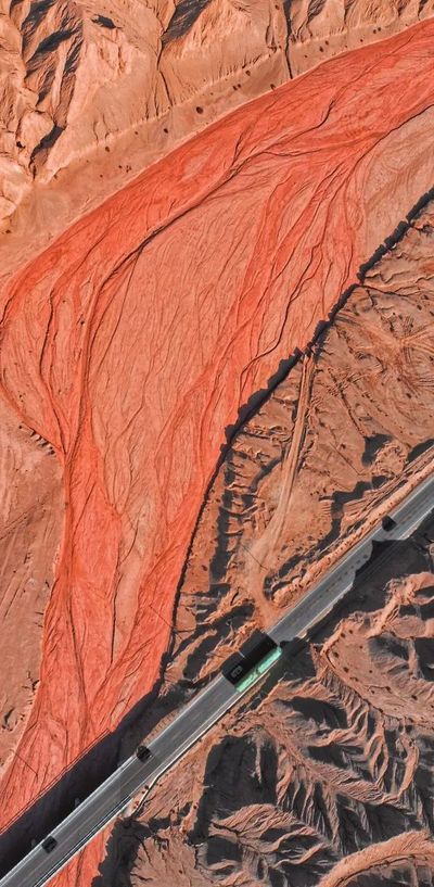 赭红色的河床中可见水流冲刷的痕迹,这些痕迹疏密有致,形似解剖图中的血管和毛细血管...