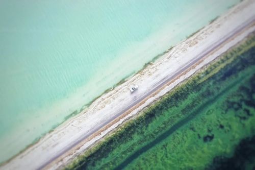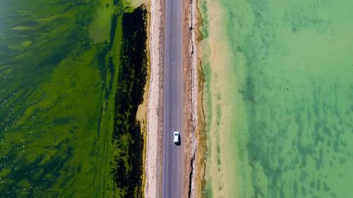 一条公路把西台吉乃尔湖分成了两半,一半是蓝色,一半是绿色。