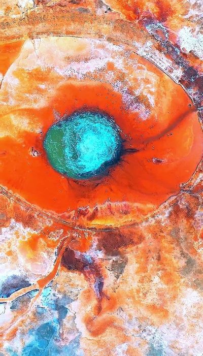 褐色的泉眼被五彩斑斓的“眼眶”所包围,红色、金色、橙色...像一块巨大的调色盘跌入泉水之中。