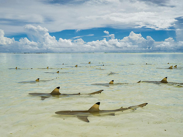 塞舌尔的亚达巴拉环礁,躲在只有几十厘米深的暖水中,一群黑鳍礁鲨正等待涨潮