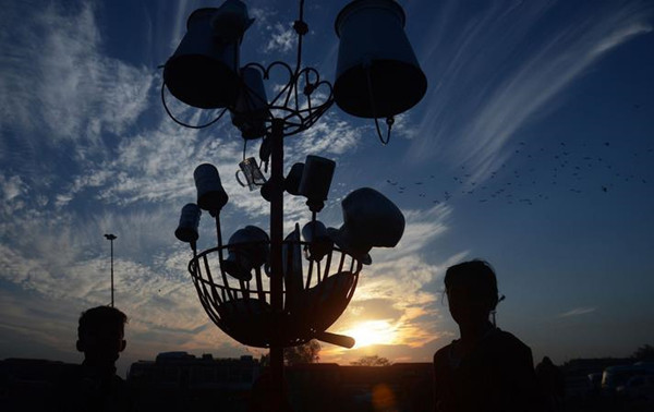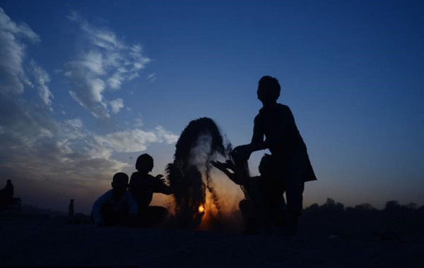 当地时间2016年12月21日,巴基斯坦拉合尔,拉维河上空现醉人夕阳和云彩,暮色下剪影美如画 。