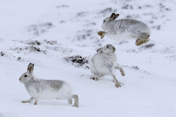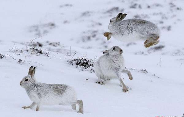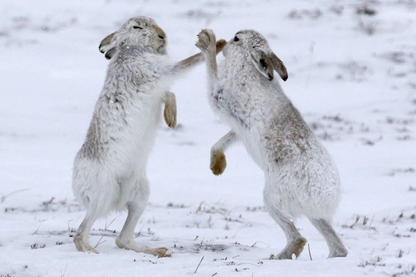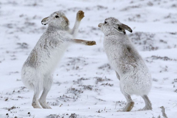 2017年1月6日报道,乍看这图你是不是也以为这是两只兔子在打架?但实际上这是野兔的一种求偶仪式,一名苏格兰摄影师在某国家公园拍到了这难得一见的一幕,两只发情期的野兔在雪地里后腿直立相互打斗,看上去就像是在进行拳击比赛。