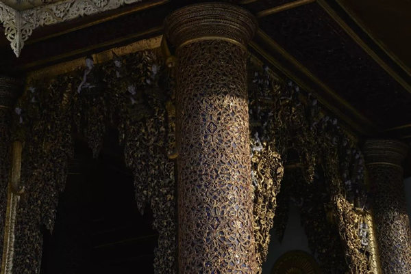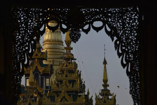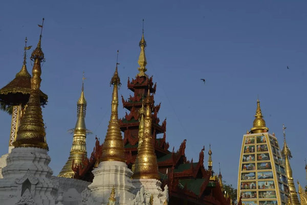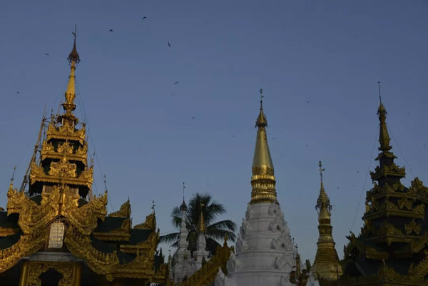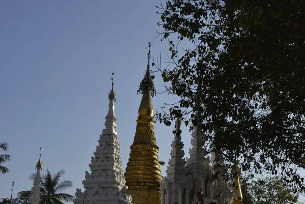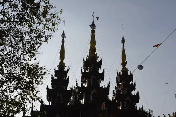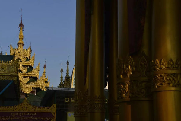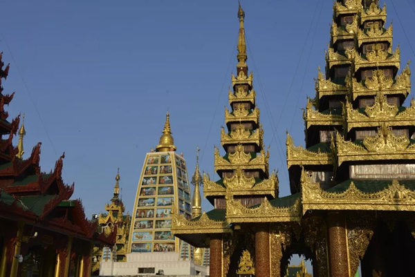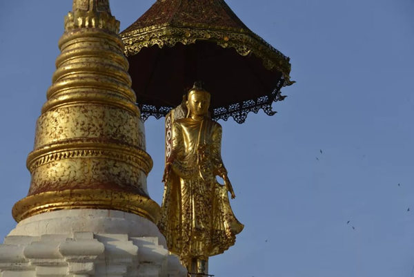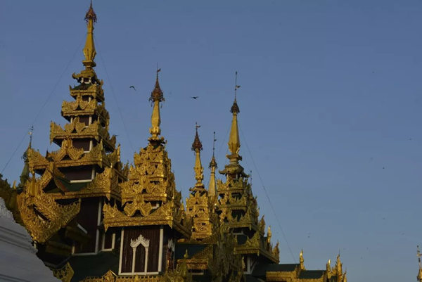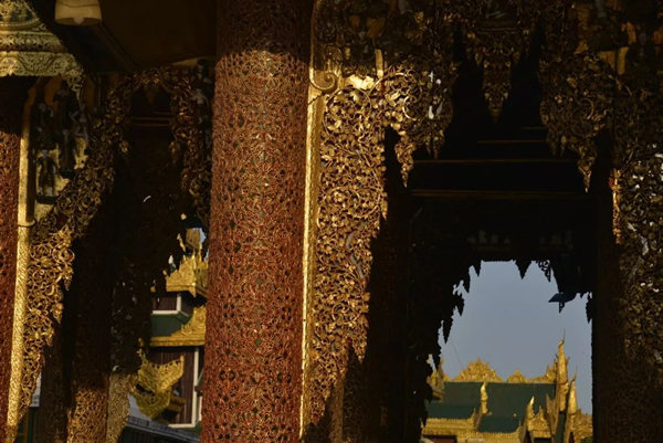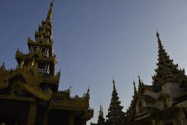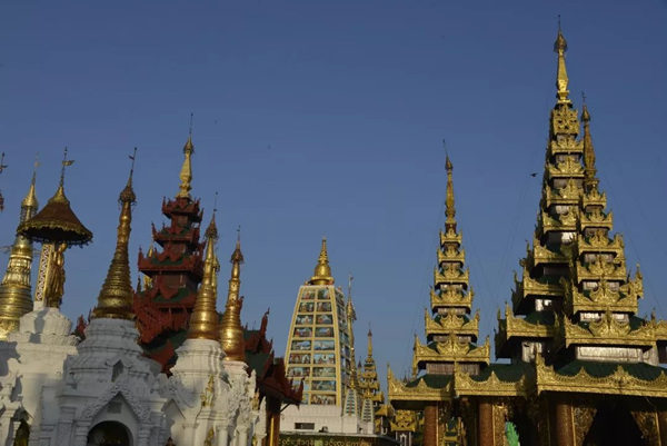 中国早在十世纪的五代,绘画就存在着富贵和野逸这两种不同的风格,而缅甸的佛塔也同样存在着这样两种绝然不同的审美差异。仰光的大金塔属于富贵的一类,任何人立足于此都能够感受到一种特别的皇家气象。几百年来人们不断在其周围建造新的佛塔,历代相续,以致现在四周环绕着大小不等、造型各异、高低错落的68座佛塔,成为一个巨大的佛塔群落;而人们还在不断为大金塔贴金,使得塔身上的黄金已有7000公斤重。而塔基座上的佛传故事浮雕瓷塑以及花纹装饰,更是以一种独特的内容和形式的结合,装扮了塔的美妙。还有那些精雕细刻的塔的门框、门楣,代表了缅甸的工艺水平和工匠精神,同样为处在不同光影中的塔增加了可以慢慢品味的内容。漫步在这里的每一步,不管是眼前,还是身后,都能够看到由塔构成的不同景观。这里的高低不等,层层叠加,各种光影关系伴着不断的变化,时时不同;加上阵阵起飞降落的鸟,以及那些挂在塔上的数以千计的金铃、银铃所发出的悦耳的铃声,一片祥和的景象来自塔影佛光,让人们感受到佛国世界的一切美好——佛国就应该是这个样子。