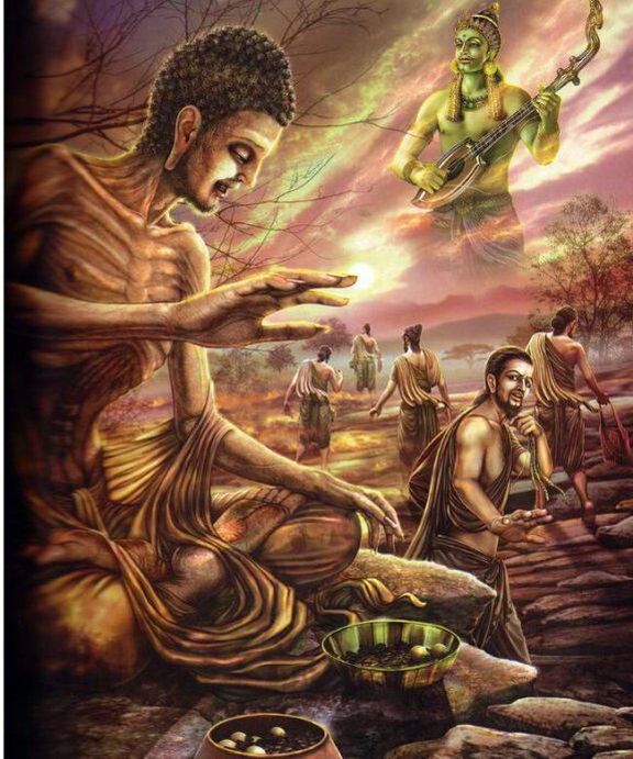 14难忍苦行:悉达多向所有世间的“成就者”们求学,尝试了世间所有的修行方式,达到了世间能达到的所有顶端境界,但他发现并没有达到他出家的目的,于是放弃了苦行。见天神于空中弹琴,了悟了中道。