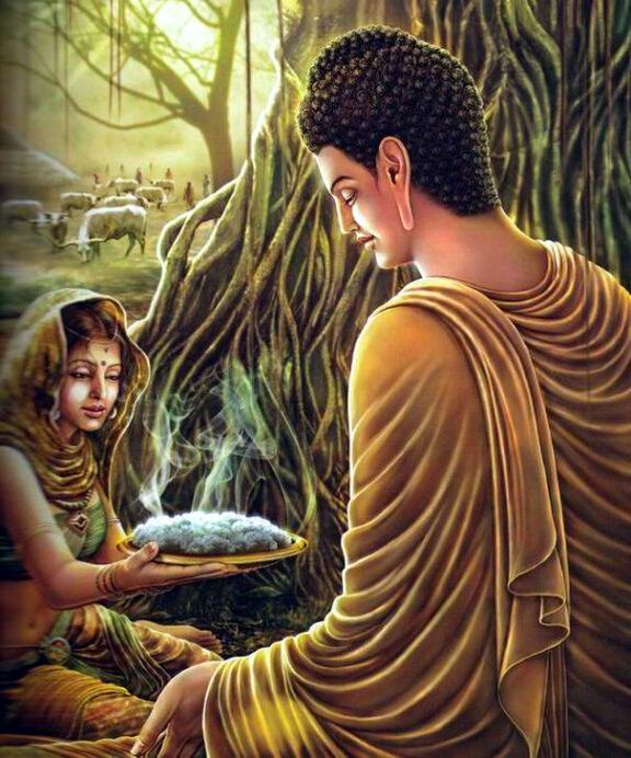 15牧女献供:一位牧女向悉达多供养了奶粥,悉达多因此得以恢复体力而重新开始修行。