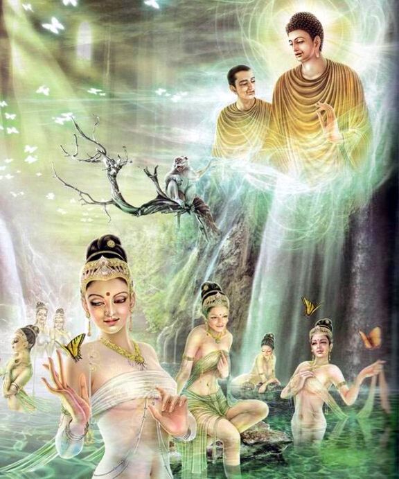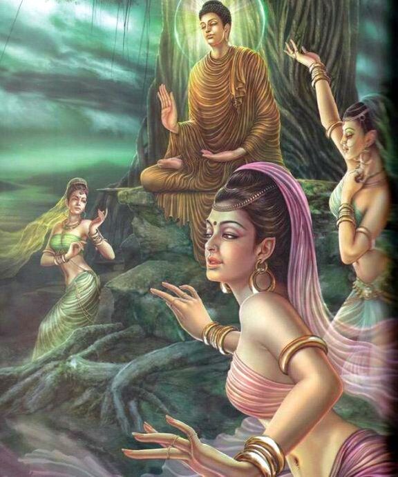 18魔女献媚:佛陀的参悟惊动了魔王波旬,于是魔王派遣他的三个女儿前来魅惑佛陀,试图让佛陀放弃参悟,然而佛陀不为所动。