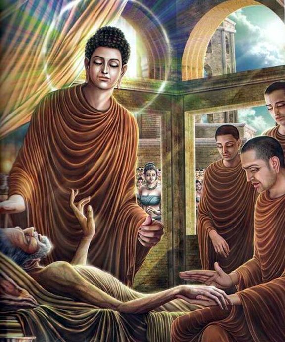 28父王逝世:佛陀见到了病重的父王,并为他开示了三皈依法,父王因此得度。逝世后,佛陀尽职孝道,亲自抬父王的棺椁,为世人以身作则。