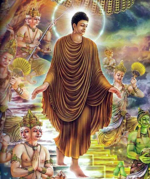 29升天说法:佛陀应天神的邀请,不动而上升天宫为了报答母亲之恩德而升天说法。