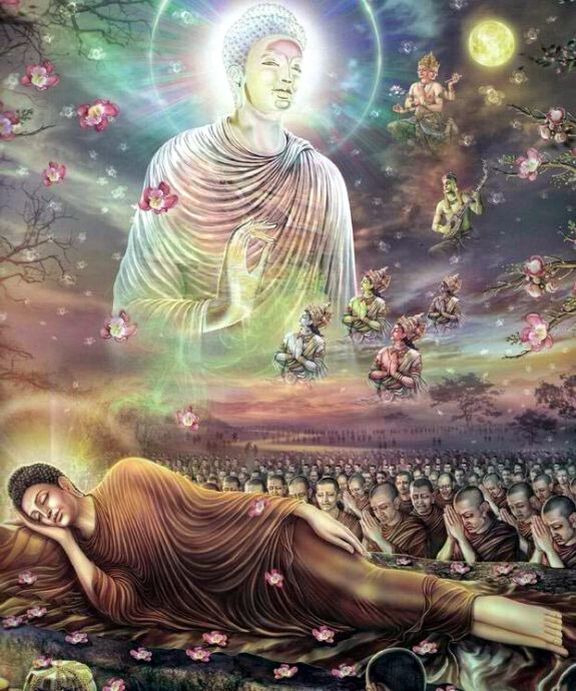 33入大涅槃:佛陀对弟子们做了最后的开示后,安详地右卧,进入涅槃。所有的人都因佛陀入灭而悲泣难止,大地震动,人神共悲,因为他们知道,他们的唯一依靠将离他们而去。佛陀并没有像他方世界的佛陀那样选择长久地住世,而是这么早就示现涅槃,因为他担心弟子们会因为他的长久住世而放逸修行,可见佛陀的良苦用心!然而佛陀的化身虽然离开了众生,法身却是一直存在的,他存在于佛陀创立的僧团之中,存在于法本文字之中,存在于整个虚空界,只要有一个众生哪怕是微小的蝼蚁需要他的帮助,只要因缘具足,佛陀的加持依然如住世时一样无二无别。
