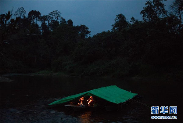 在缅甸北部实皆省,很多居民傍水而居,与自然和谐相处,依然保持着传统的生活方式。这是在缅甸北部实皆省的大麦地野生动物保护区钦敦江支流上,船夫在河床上搭建的帐篷下休息(5月31日摄)。新华社记者 金立旺 摄