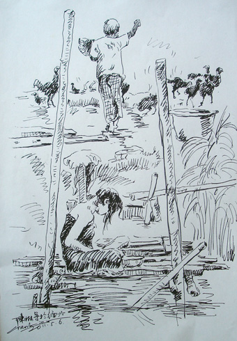 我独自一人租用了一只小船在茵莱湖中走走停停。船里有较宽的空间供我一人使用。虽然有时有些晃动但也按抑不住我内心的激动。我手中的钢笔似乎也很高兴,非常流利地在我的画纸上留下了许多珍贵的线条。我只后悔我所带的纸头太少,不到半天就没有了地方可画。翻遍了全身的口袋,车票,地图,住宿单都留下了我的记录。最后我还是没有胆量在我的护照上乱来,只好将衣服脱下画了满满的谁也看不懂的东西。