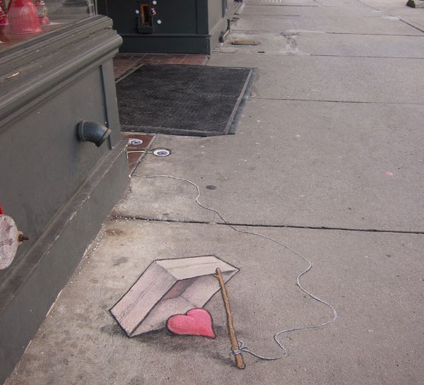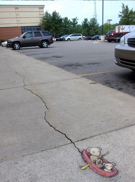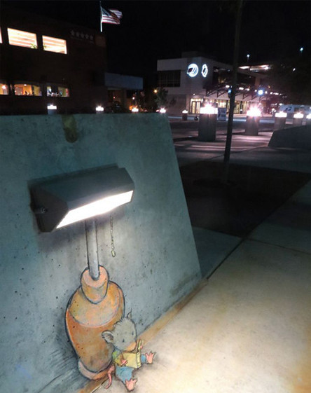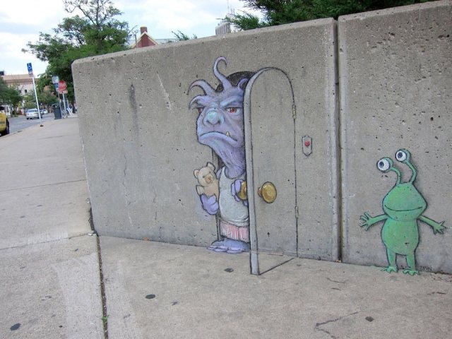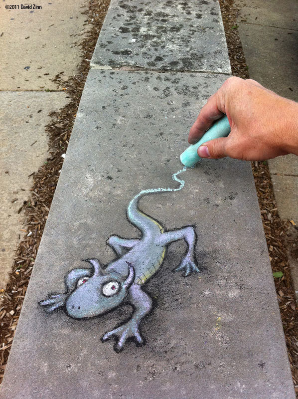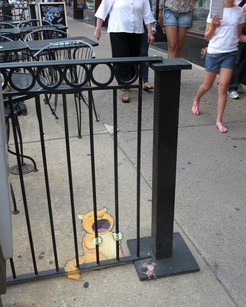 David Zinn是来自美国密歇根州的一位艺术家。他整天奔波于安娜堡的大街小巷,借助街头建筑、道路上的缝隙等等,用粉笔创造了许多街头童话。