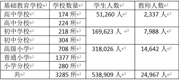 2019—20学年度若开邦的各类基础教育学校的数量、学生人数及教师人数如下: