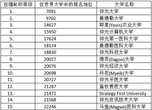 缅甸各地大学的名次排名榜,如果放在全球范围来看,也许算不了什么(有人会说它们在全球范围内的排名都在1万名以后呢),但在缅甸各大学中仍有一定的影响力和代表性。全缅各大学如能在自己力所能及的范围内做好自己的工作,相信各大学都会有进一步发展的前途与空间。