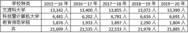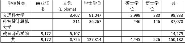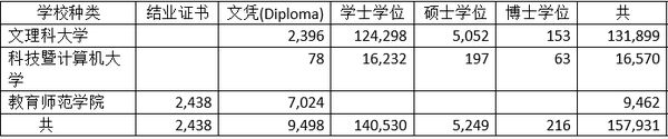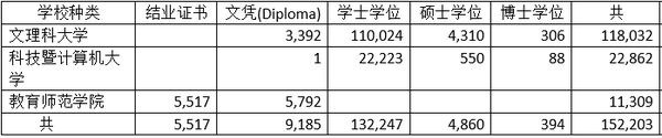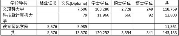 这期间共有60多万人由这些大学获得结业证书、文凭、学士学位、硕士学位及博士学位等。历年来获得这些证书及学位的人数如下表: