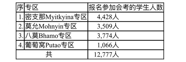 各专区报名参加这大学入学考试的人数分别为:密支那(Myitkyina)专区4,428人,莫允(Mohnyin)专区3,509人,八莫(Bhamo)专区3,774人,葡萄窝(Putao)专区1,066人,四个专区报名的学生共有12,777人。