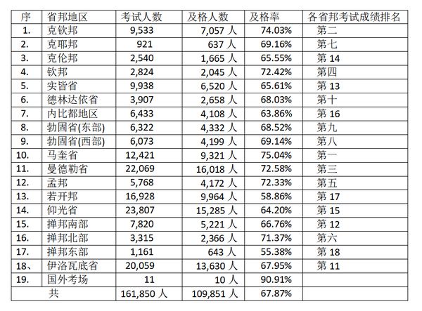 查看一下全国的录取率,居然高达67.87%。这可说是自有高考以来录取率最高的一年。各省邦中录取率最高的是马奎省,录取率高达75.04%。第二是克钦邦,录取率为74.03%,第三为曼德勒省,录取率为72.58%。而多年来位居高考榜首的孟邦,今年位居第五,但录取率仍高达72.33%,与位居第四的钦邦、位居第三的曼德勒省相差无几。