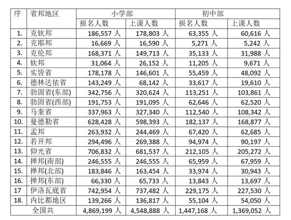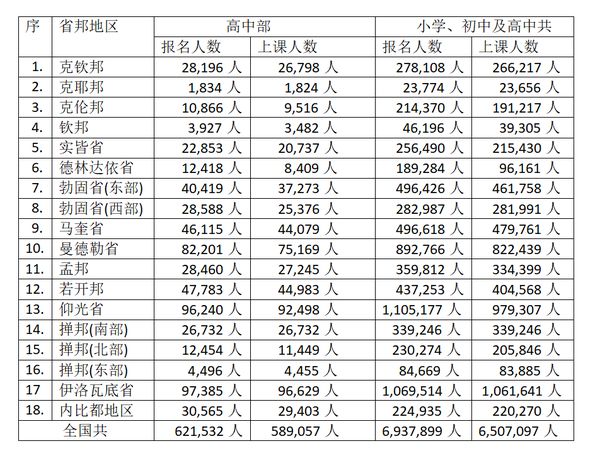 管委会主席在这里说的是一个总数,各省邦地区各有多少学生上课没有说出来,这具体数据也确实很难统计。查阅今年开学以来各报纸上的报导只有在开学初期见到公布一次,那是6月2日这一天的上课人数,这一天所公布的中小学生报名人数、上课人数如下表: