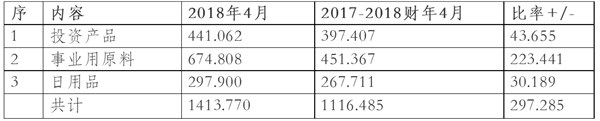 据悉,从国外进口方面2018年4月进口额获得14.14亿美元、相比去年同期增加2.97亿美元。从国外进口的货物相比去年同期如下: