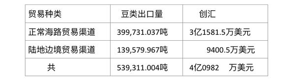这期间向国外出口的各种豆类,由正常的海路贸易渠道出口各种豆类399,731.037吨,创汇3亿1581.5万美元;由陆地边境贸易渠道出口各种豆类139,579.967吨,创汇9400.5万美元;故这期间豆类共出口539,311.004吨,创汇总值4亿0982万美元。