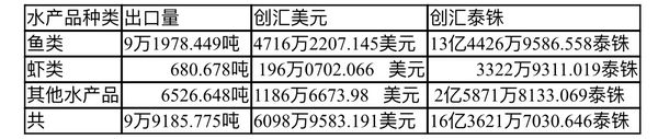 本财政年度7个月内由高栋FOB检查站出口的鱼类为91,978.449吨,创汇47,162,207.145美元及1,344,269,586.558泰铢;出口虾类680.678吨,创汇1,960,712.066美元及33,229,311.019泰铢;其他水产品出口6,526.648吨,创汇11,866,673.98美元及258,718,133.069泰铢。故水产品共出口99,185755吨,创汇60,989,583.191美元及1,636,517,030.65泰铢。