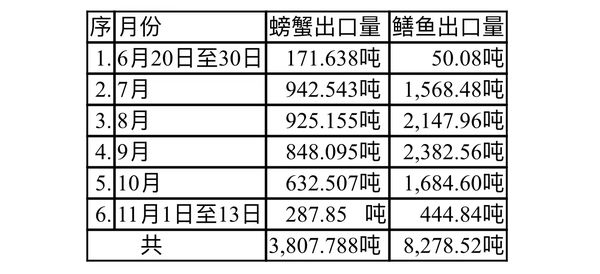 这期间每月出口的螃蟹及鳝鱼如下表: