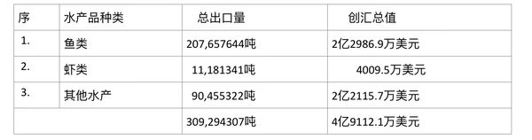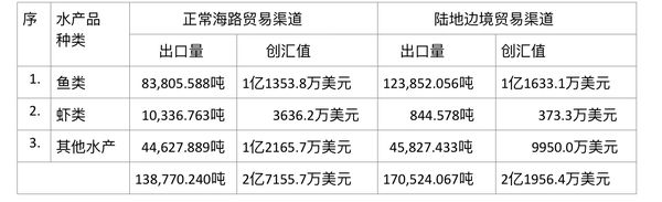 在这些水产品中,鱼类由正常海路贸易渠道出口83,805.588吨,创汇1亿1353.8万美元;由陆地边境贸易渠道出口123,852.056吨,创汇1亿1633.1万美元;故鱼类出口共为207,657.644吨,创汇2亿2986.9万美元。