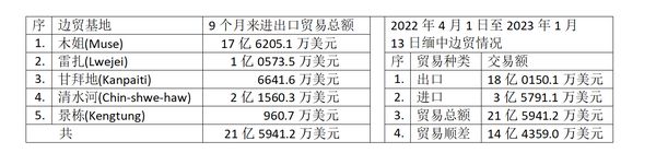 缅中边贸的5个贸易基地,分别为木姐、雷扎(Lwejei)、甘 拜地(Kanpaiti)、清水河(Chin-shwe-haw)及景栋(Keng-tung),这5个贸易基地在这9个多月来的进出口贸易总额分别为: