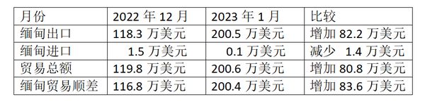 比较这2022年12月及2023年1月的对外贸易情况,在今年1月份期间进口虽少1.4万美元,但出口却多82.2万美元,故贸易总额增加80.8万美元。贸易总额增加的原因是,根据两国政府之间签订的有关稻米出口条约,这个月内由实兑贸易基地向孟加拉国的有关港口出口了白米2,500吨,创汇100万美元,故两国之间的边贸总额在2023年1月份有了明显的增加。
