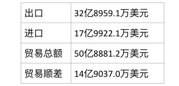 这贸易总额是本财政年度自2022年4月1日至2023年3月10日为止,11个多月的时间所获得的贸易总额。这其中出口为32亿8959.1万美元,进口为17亿9922.1万美元,贸易总额为50亿8881.2万美元。