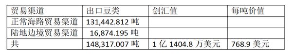今年4月1日至5月5日期间向国外出口的豆类中,由正常海路贸易渠道出口的豆类有131,442.812吨,由陆地边境贸易渠道出口的豆类由16,874.195吨,故出口豆类共有148,317.007吨,由此获得1亿1404.8万美元的收入。