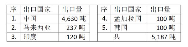 这些橡胶中,通过海路贸易渠道,有4,630吨橡胶出口到中国,237吨出口到马来西亚,120吨出口到印度,各100吨出口到孟加拉国及韩国。而由边贸出口的494吨橡胶都是输送往中国的。