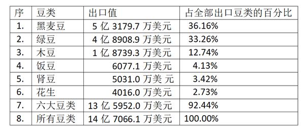 六大出口豆类的出口值就占了全部豆类出口值的92.44%了。