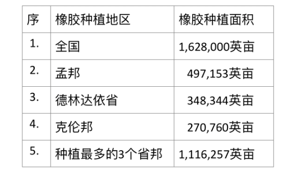 在缅甸,橡胶主要生产地区为孟邦、克伦邦、德林达依省、勃固省及仰光省。根据2018—19年度橡胶生产季节时期的数据,当时缅甸全国橡胶的种植面积为162.8万英亩,而主要的橡胶种植地区,孟邦的胶园面积为497,153英亩,德林达依省种植面积为348,344英亩,克伦邦的种植面积为270,760英亩。这3个省邦的种植面积占全国橡胶种植面积的三分之二以上。