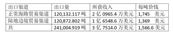 出口渠道中,海路渠道及边贸渠道的出口量相差无几,边贸渠道出口量甚至还稍多一些。但所获收入中,海路出口所获收入却远多于边贸出口收入;每吨出口价钱中,海路出口价钱比边贸出口多300多美元。